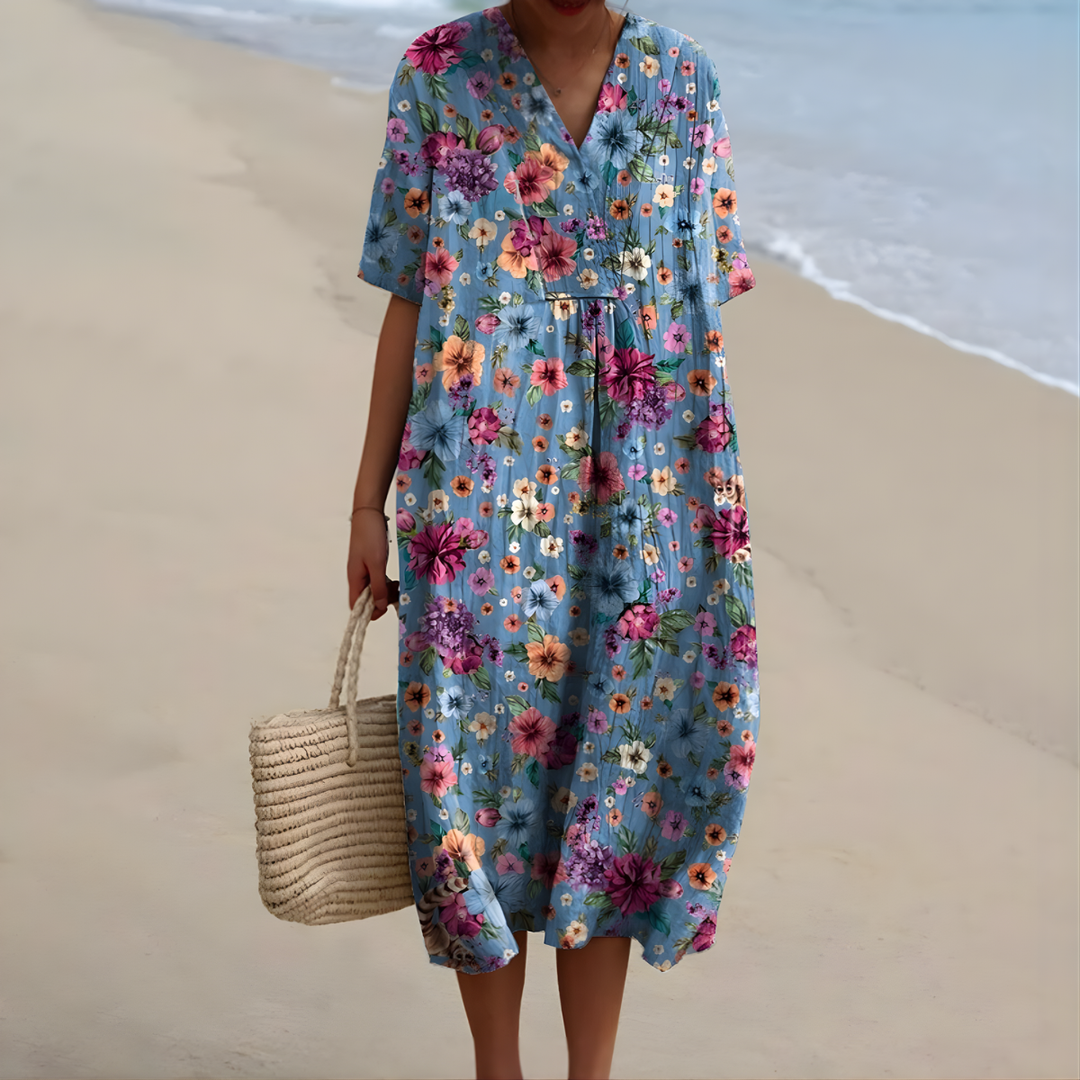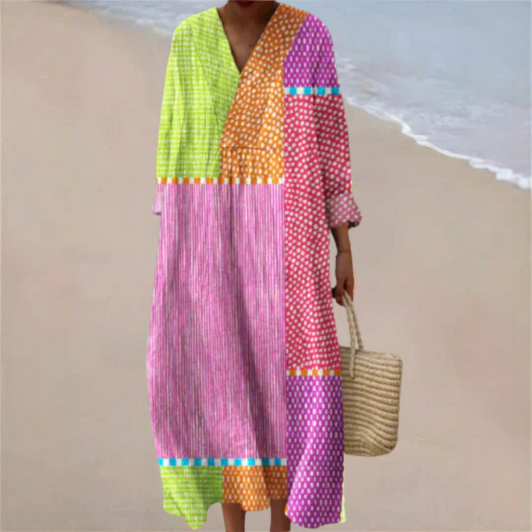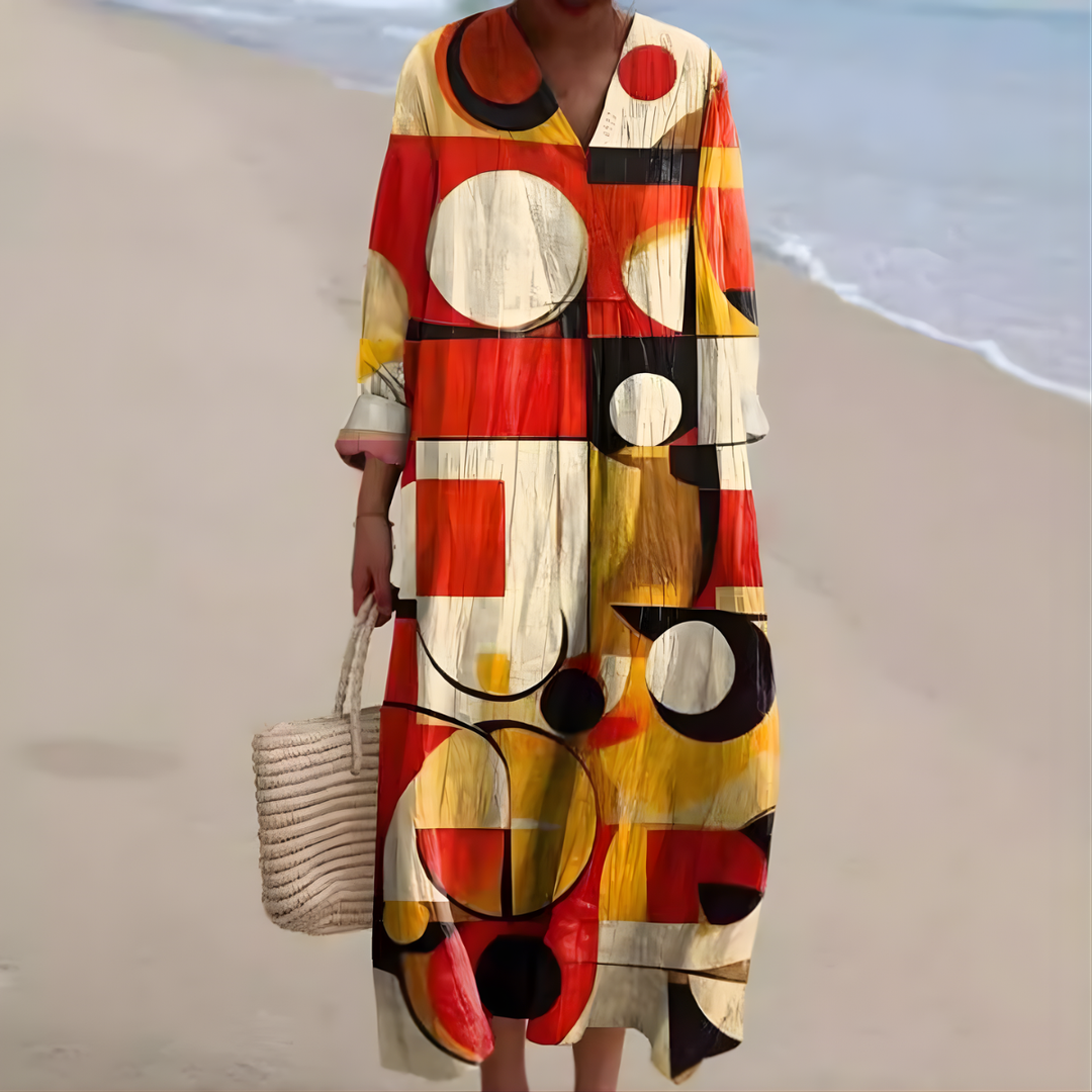 "I just had to snap a photo to show how beautifully this dress fits. The colors are stunning and the fabric feels so light. I feel wonderful in it!"